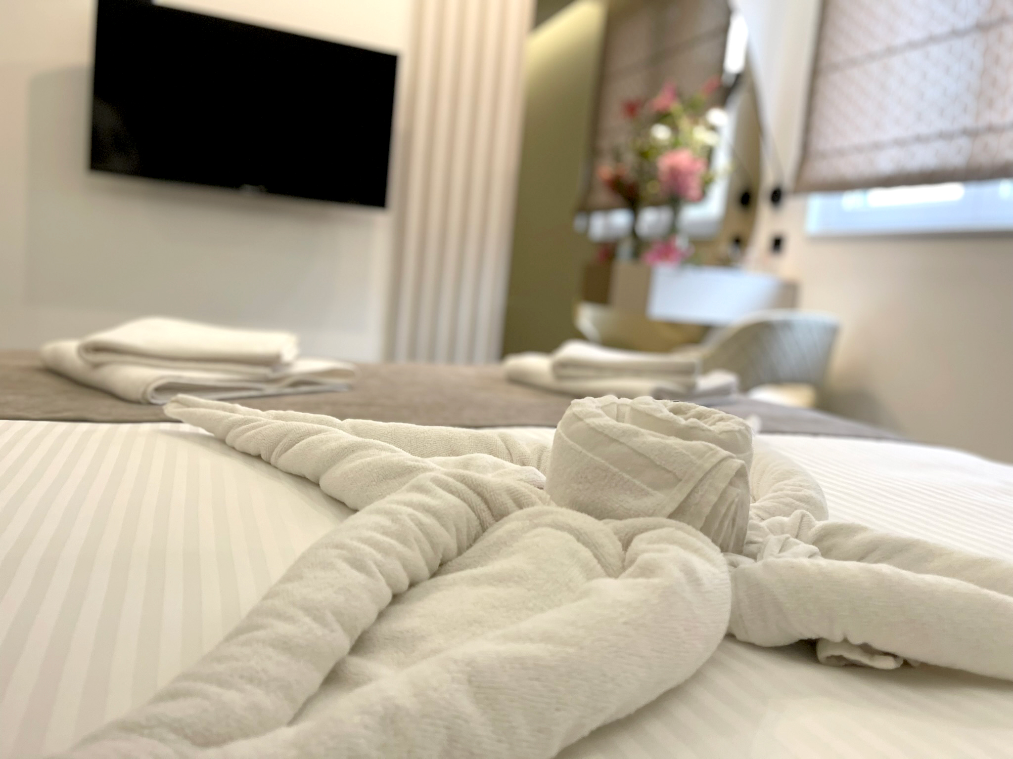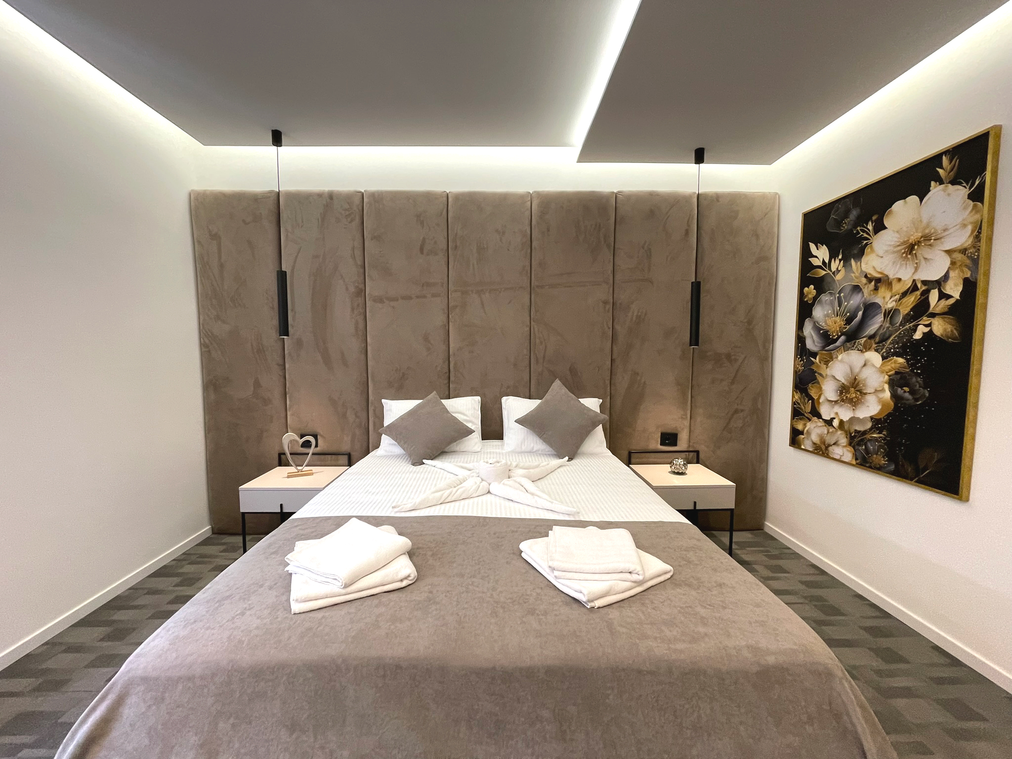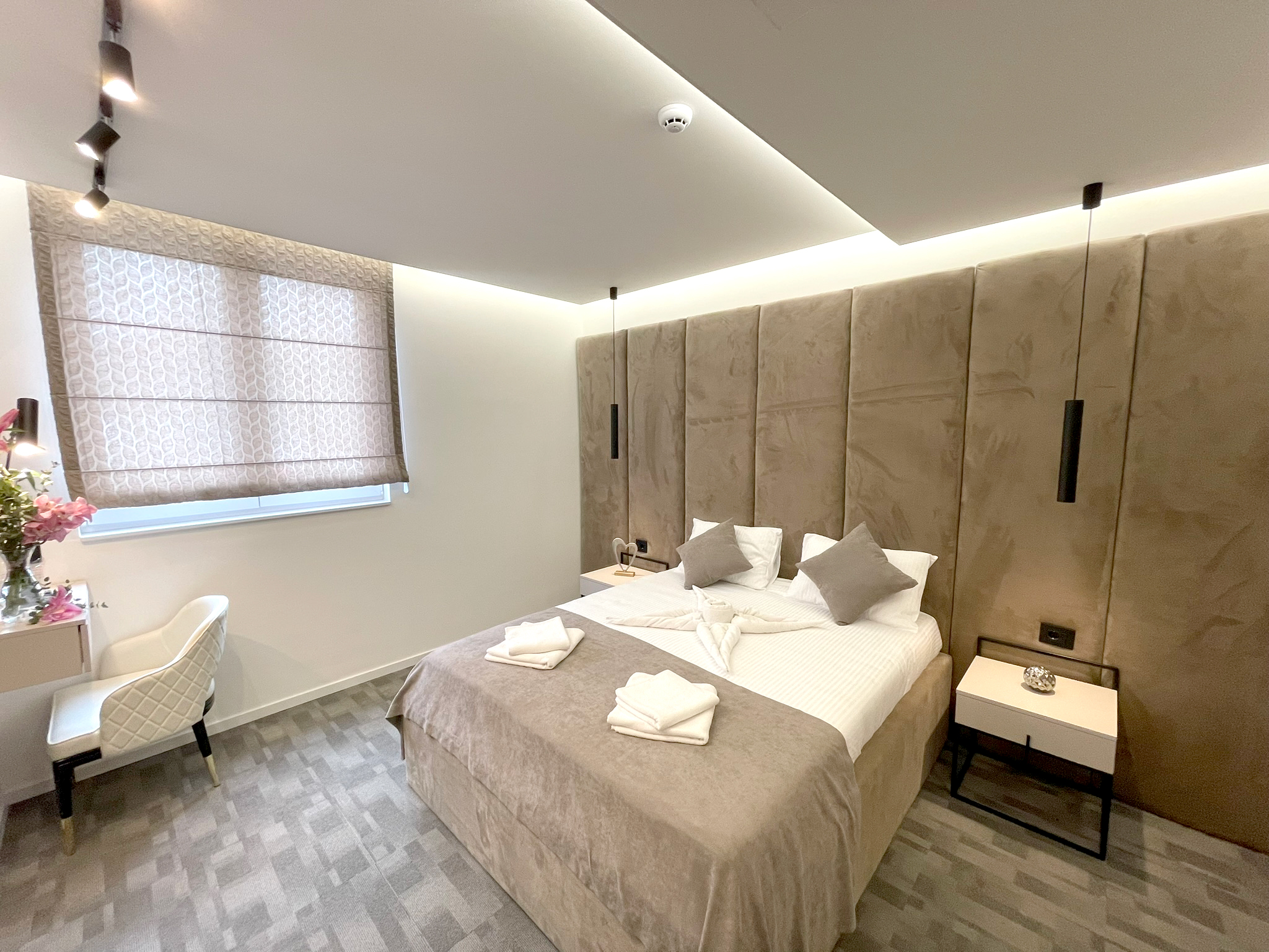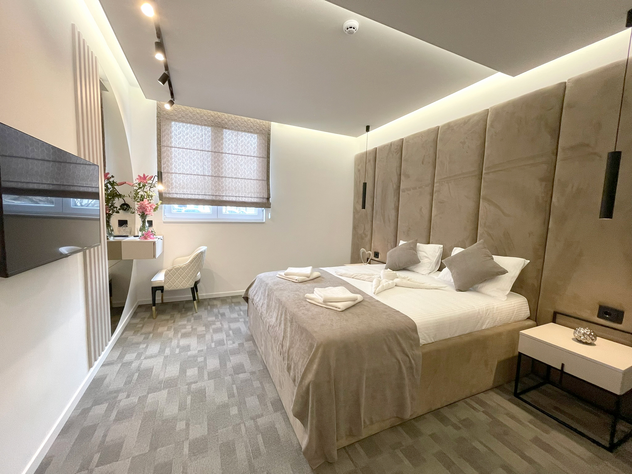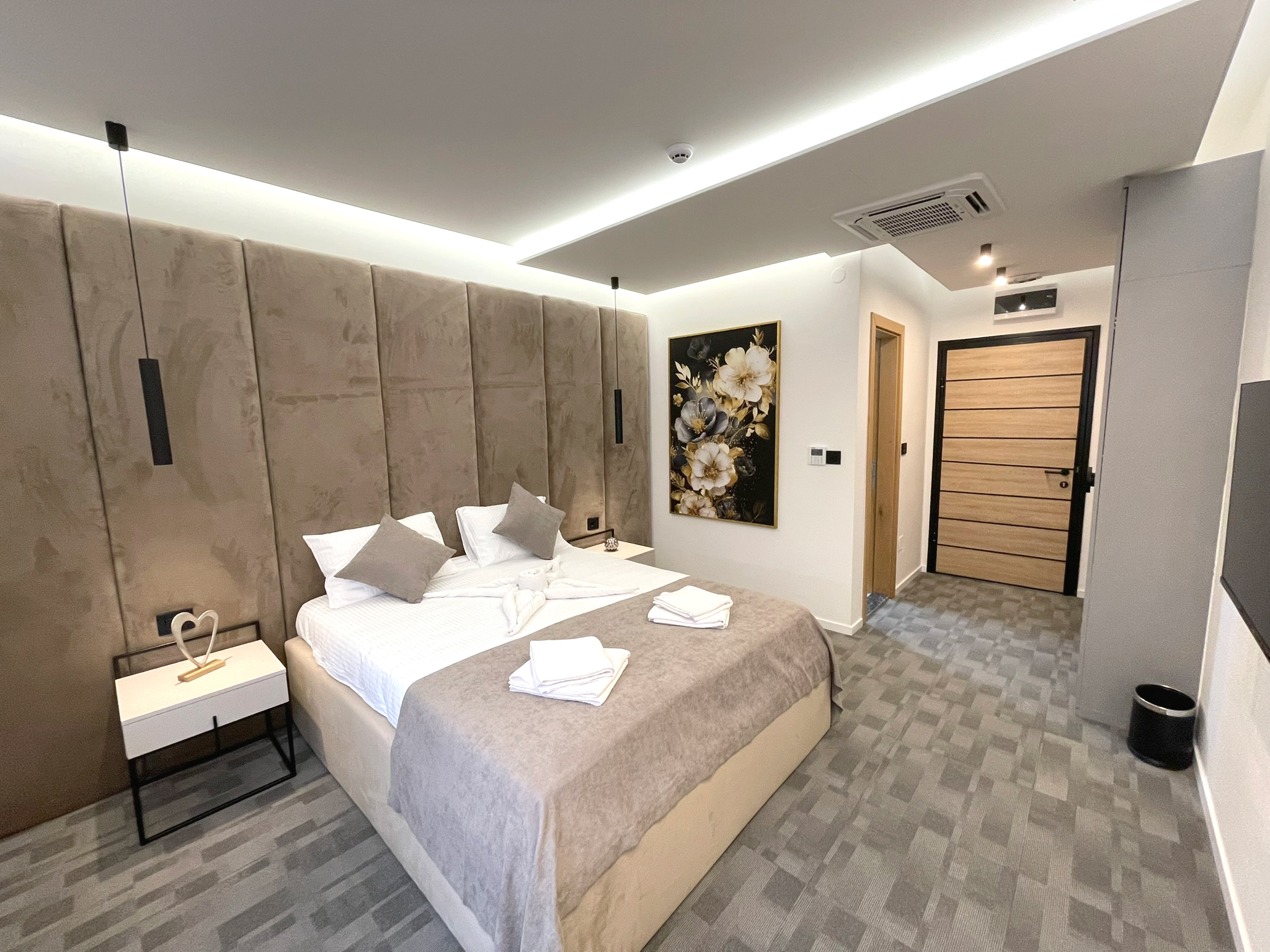 Gostima je na raspolaganju 15 Delux soba, ukupnog kapaciteta 40 osoba. Sve sobe su moderno opremljene, te svaka posjeduje krevet, noćni ormarić ili polica na svakom spavaćem mjestu, ormar ili ugradna ormarska niša, sto, ogledalo, zidna vješalica za vanjsku odjeću i noćna svjetiljka. Osim toga, u sobi se nalazi i oprema kao što su TV i sef. Hotelske sobe su potpuno klimatizovane. Takodje, gostima je na raspolaganju besplatan wi-fi.